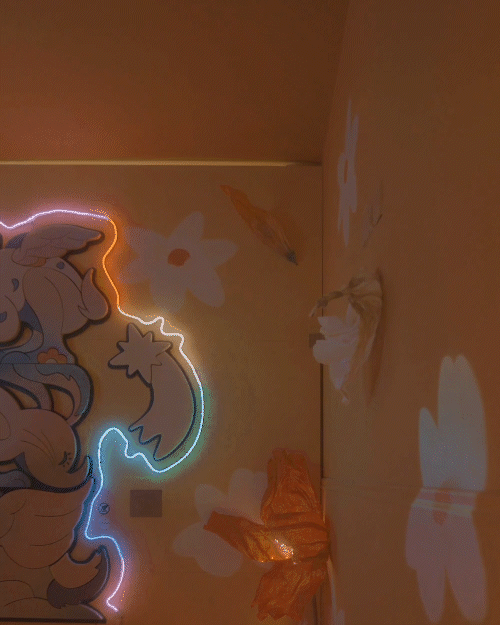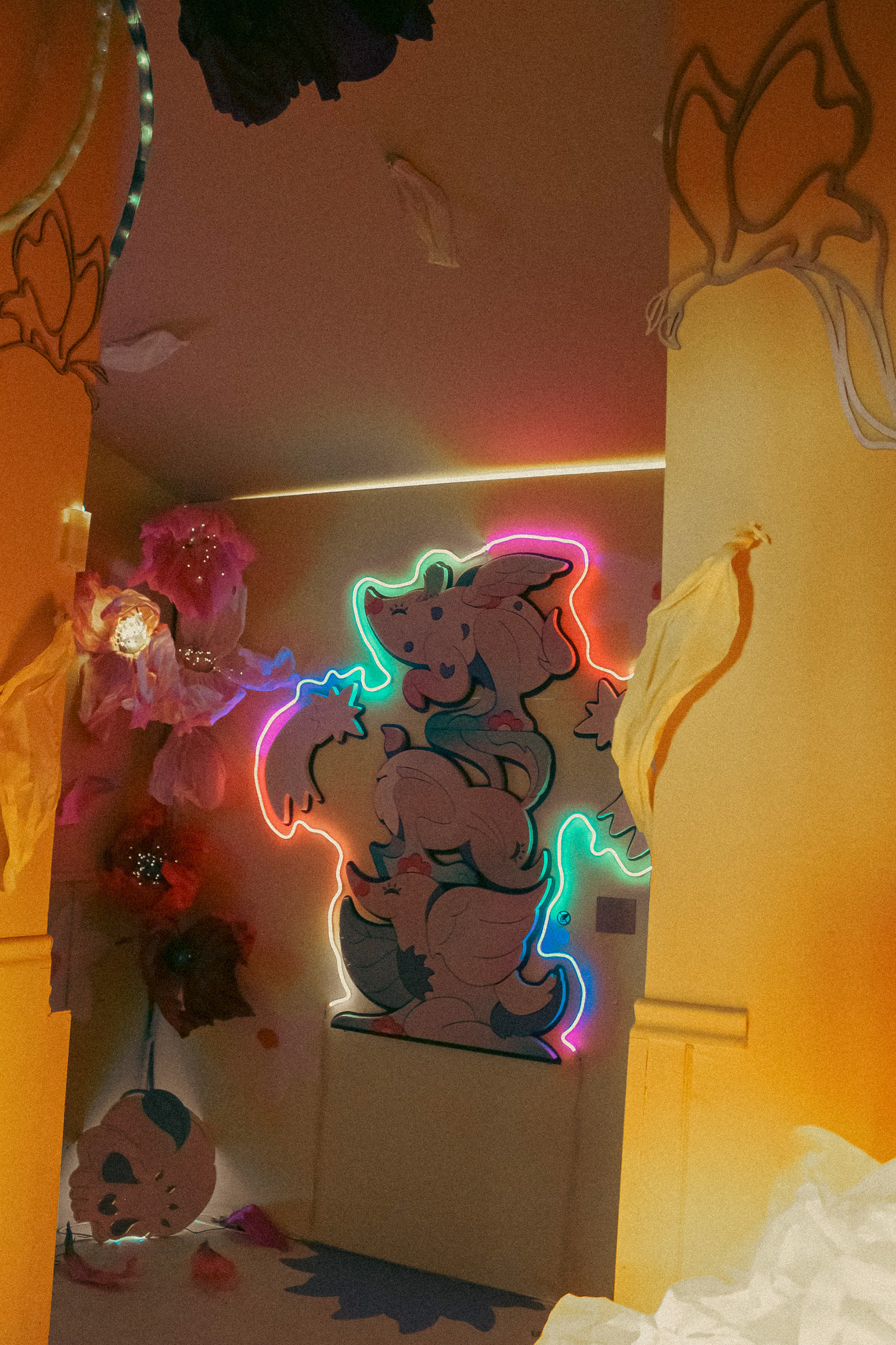 A vibrant mural installation brought to life with three-dimensional elements — XXL flowers, foam sculptures, custom neon lighting, and delicately laser-cut wooden ornaments — combining color, form, and light into an immersive experience.